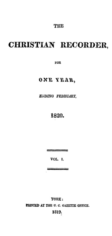 The Christian Recorder was a religious newspaper, the journal of John Strachan. Printed in 1819-1821; there were two volumes of a monthly publication.